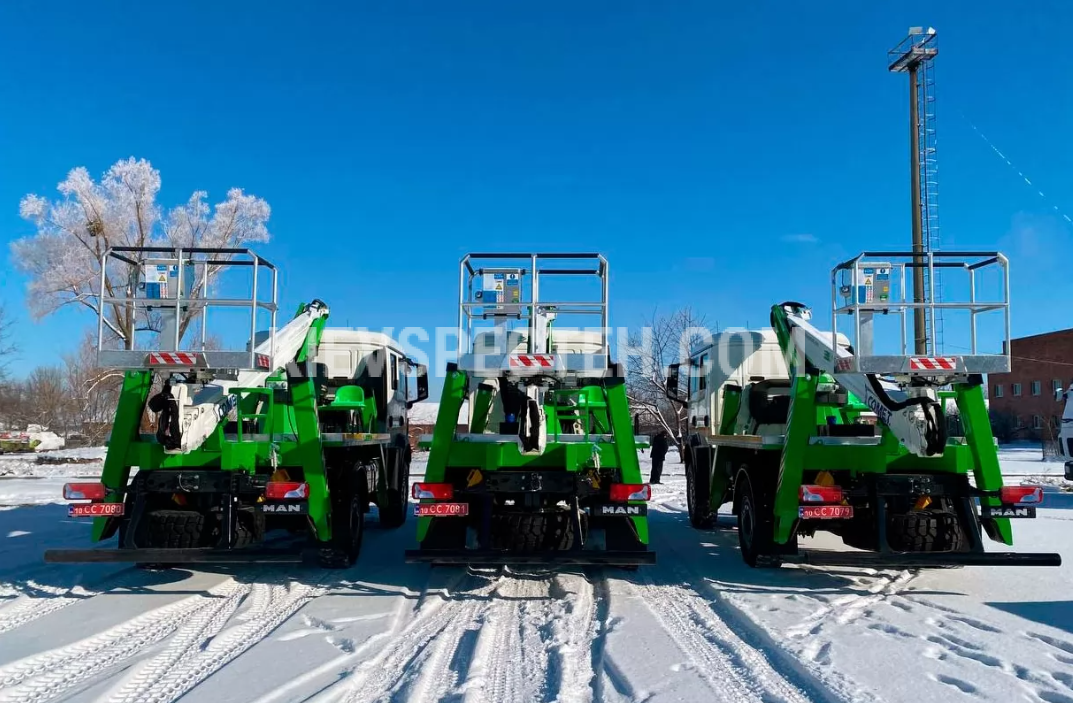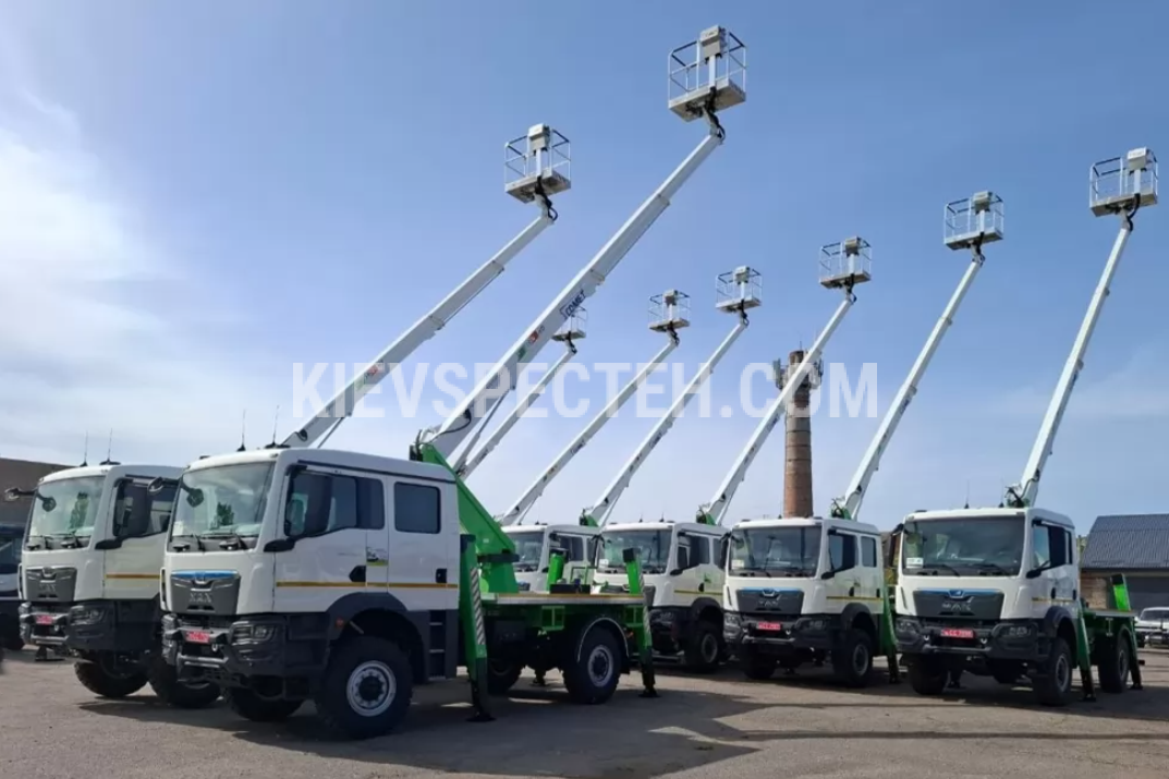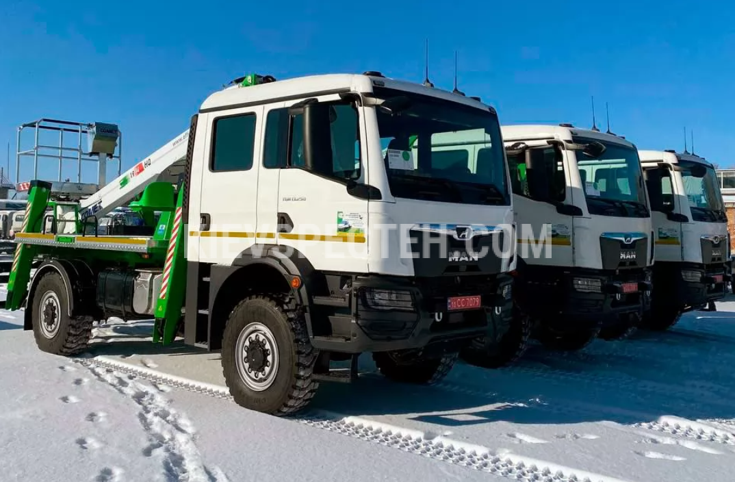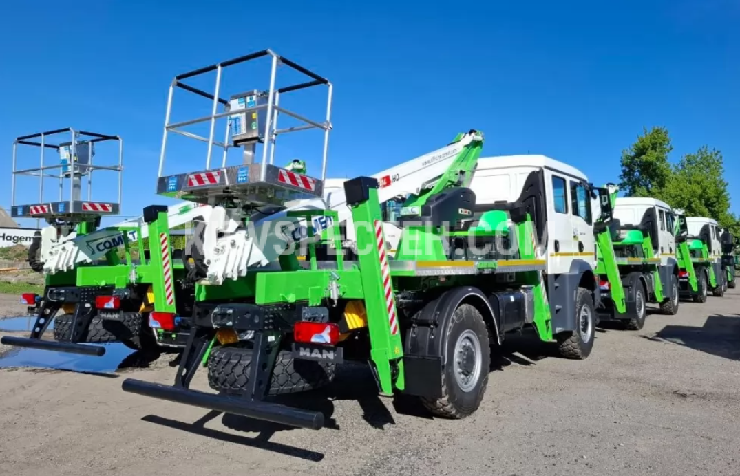 - Компактність у транспортному положенні: У складеному стані вишка не виступає за габарити шасі MAN, що дозволяє впевнено маневрувати на вузьких лісових дорогах або в міській забудові.
