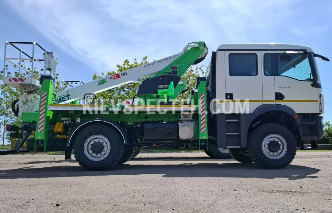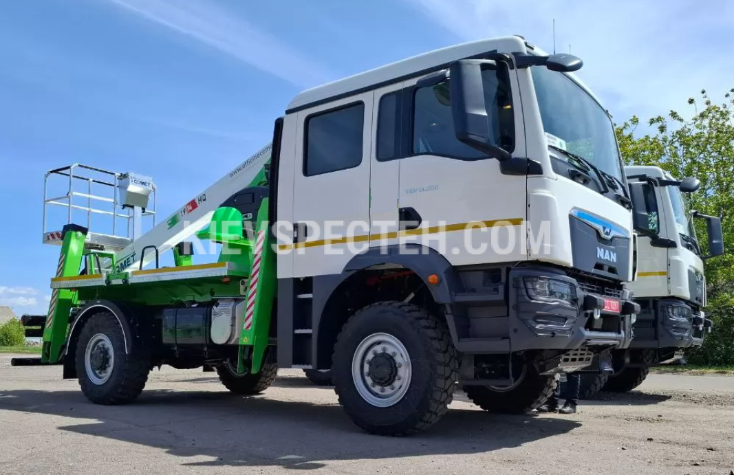 Автогідропідіймач COMET 19 на шасі MAN TGM 13.250 4x4 від компанії "Київспецтех" - гідравлічний, телескопічний, повноповоротний підйомник призначений для підйому робітників з інструментами і матеріалами на висоту до 18 м для виробництва будівельних, монтажних, ремонтних та інших видів робіт. Вантажопідйомність лльки становить 250 кг. Бічний виліт 14 м. Кут повороту стріли становить 360°