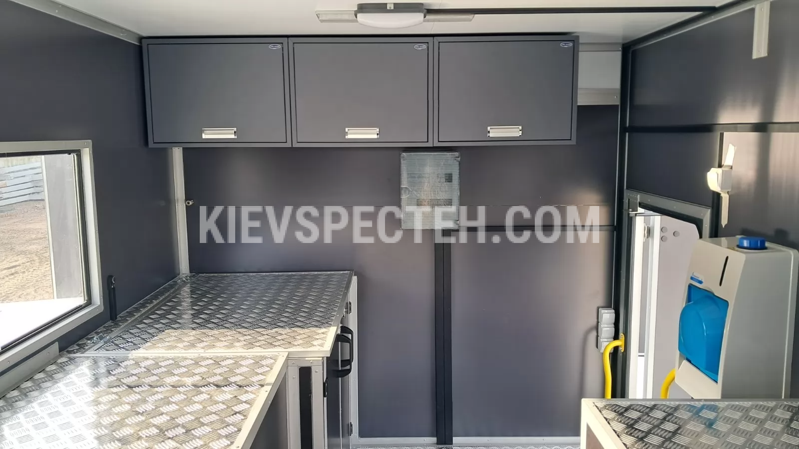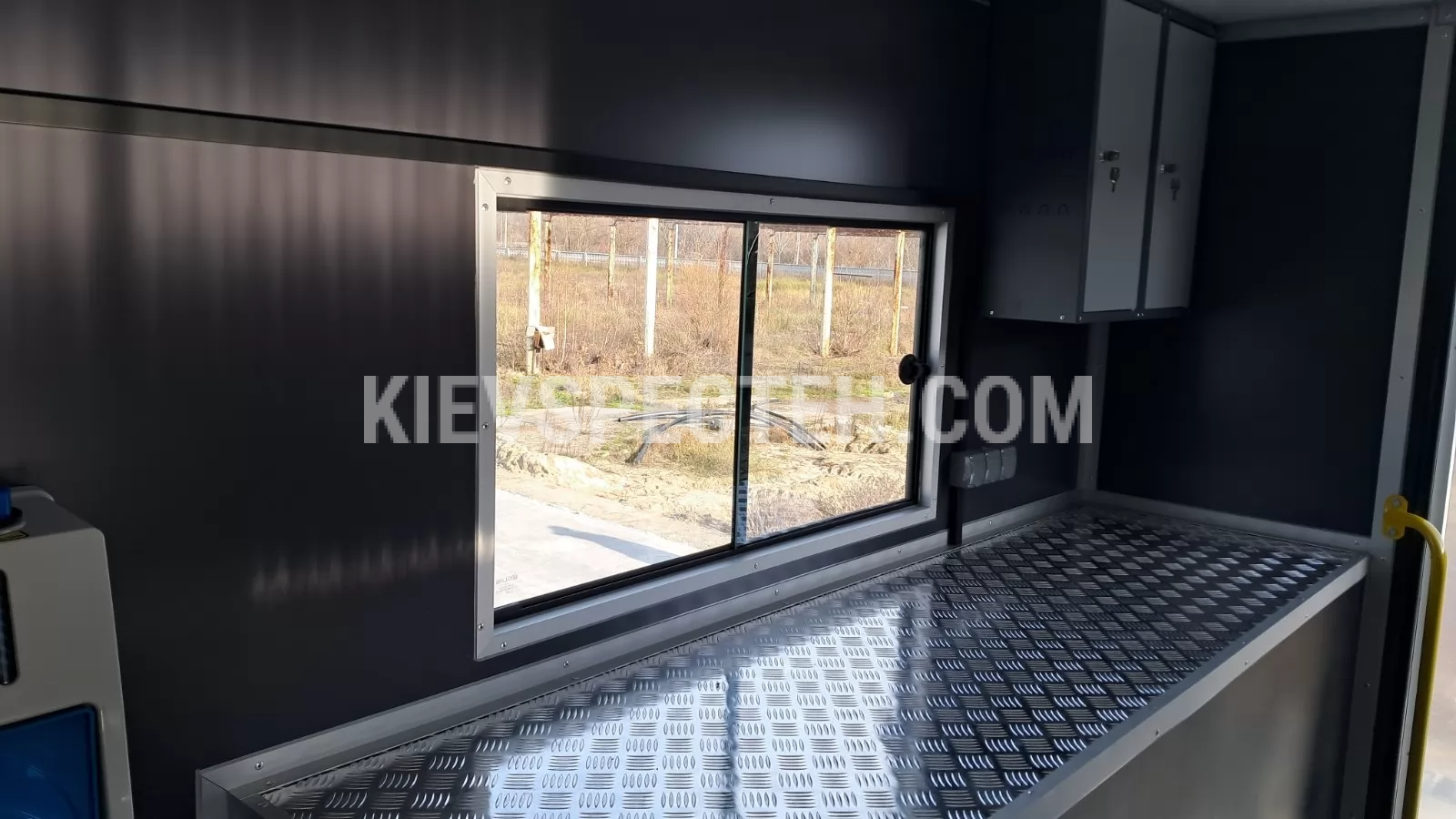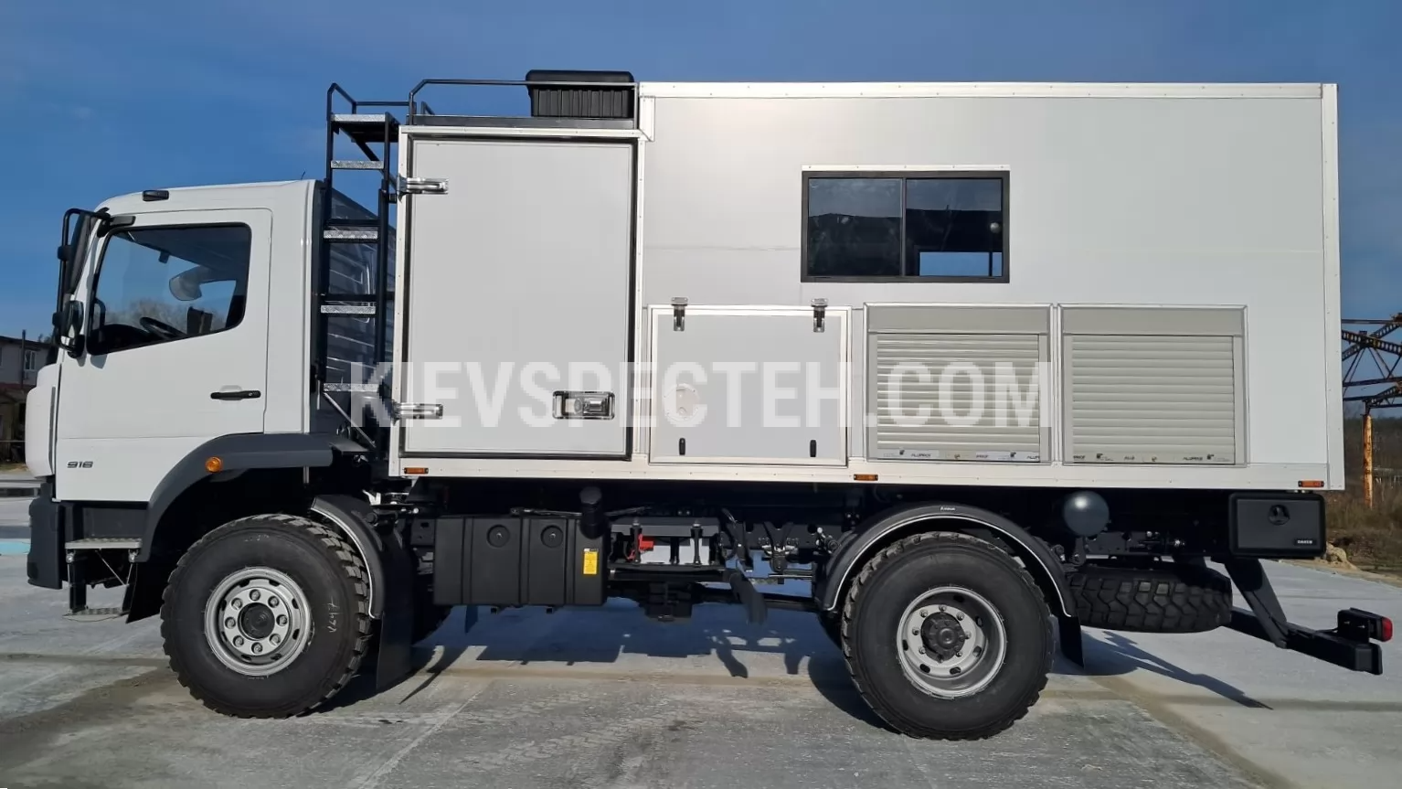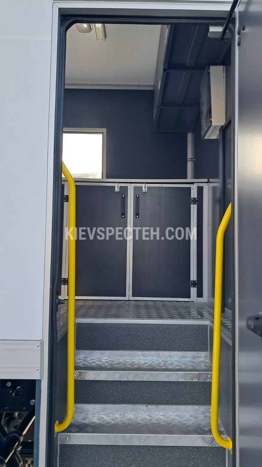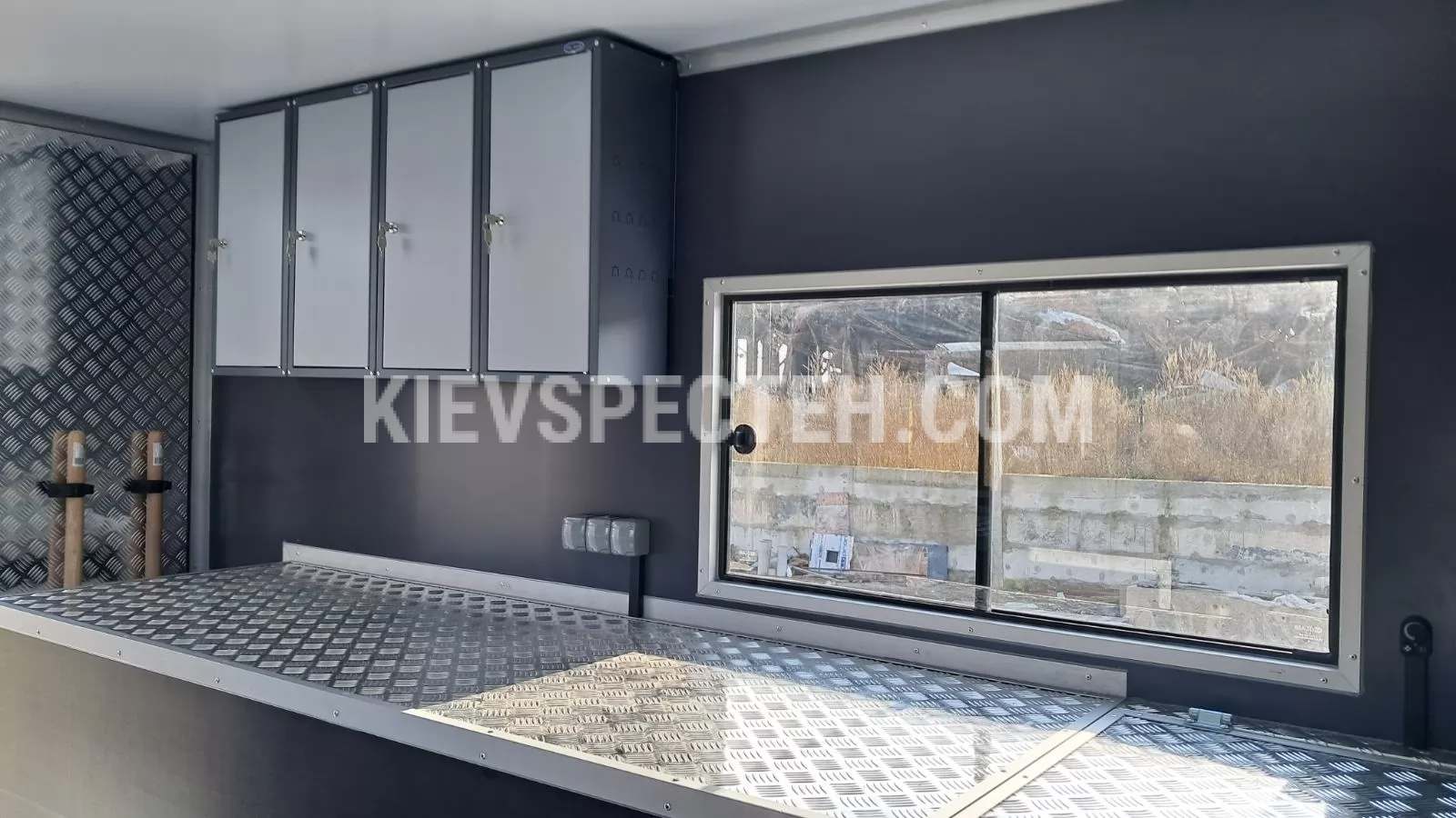 Праворуч і ліворуч передбачені зовнішні ніші для інструментів, обладнання та генератора, що закриваються автомобільними ролетами або дверима. У правій задній ніші встановлено відкидний верстак, у лівій — додаткова полиця для комплектуючих. На правому боці даху змонтована сонцезахисна водонепроникна маркіза. На кабіні розміщений багажний ящик. Попереду фургона встановлено дві стаціонарні драбини для доступу до даху та ящиків.