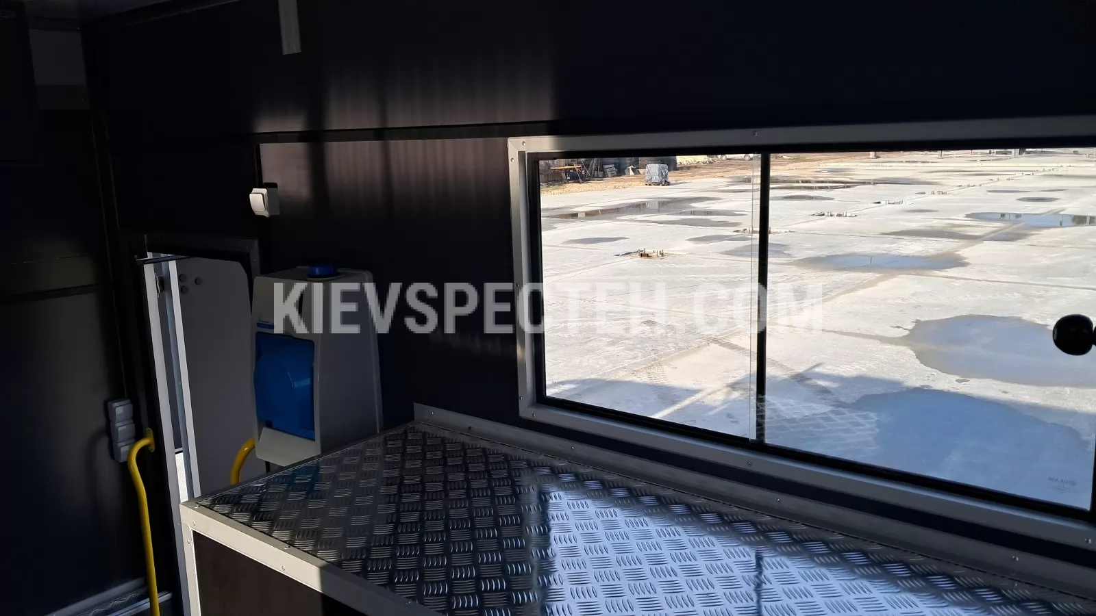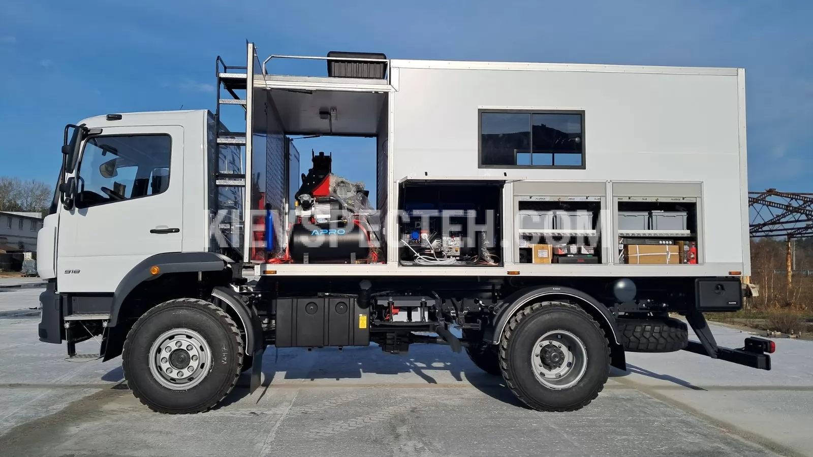 Шиномонтажний відсік розміром 1250 × 2150 × 1700 мм, оснащений шиномонтажним комплексом для легкових і вантажних автомобілів. У ніші розміщений повітряний компресор. Доступ до відсіку можливий з обох боків через двері. Ремонтний відсік розміром 3600 × 2150 × 2000 мм, укомплектований верстаками, нішами та стелажами. Встановлений рукомийник з підігрівом води об’ємом 8 л. Основний вхід у фургон розташований праворуч, обладнаний сходами автобусного типу та поручнями.