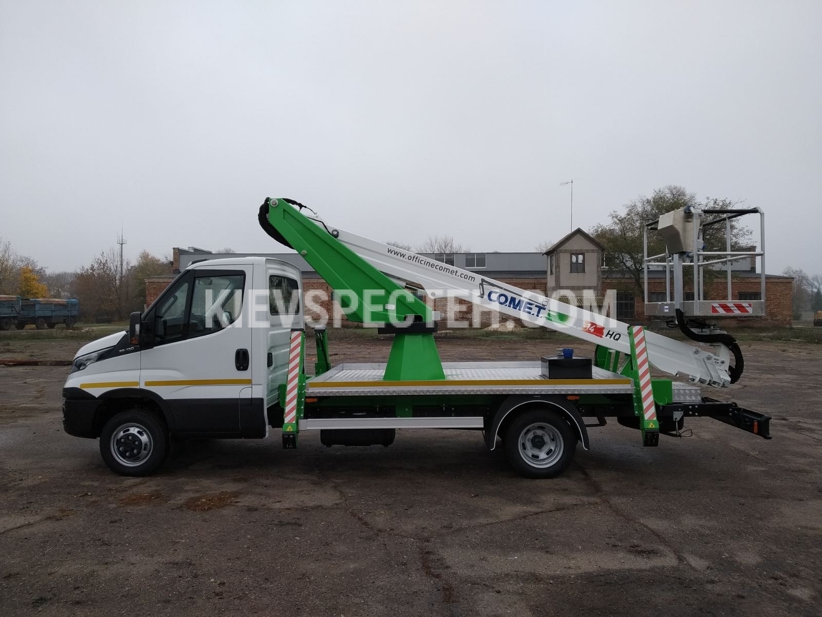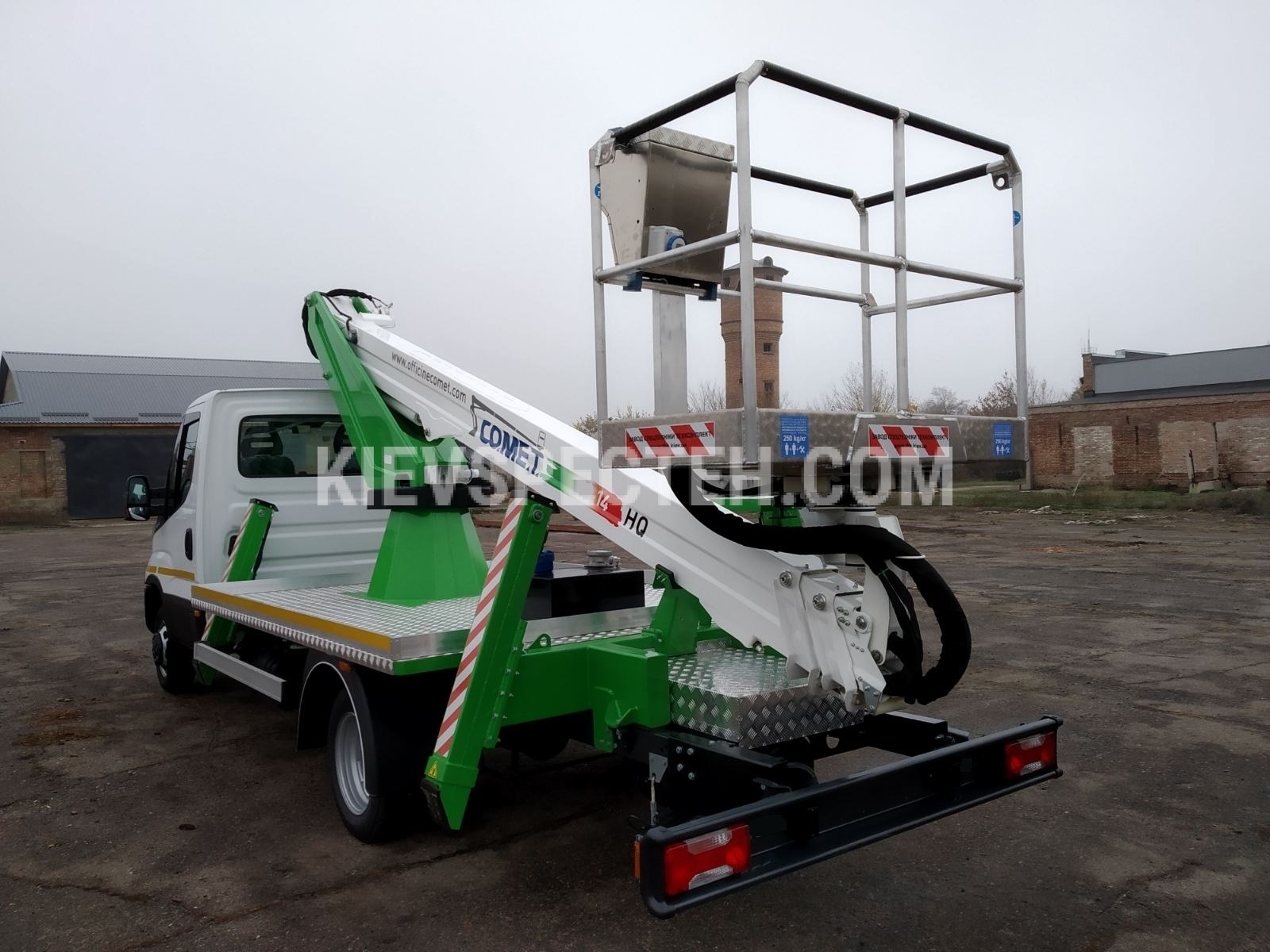 Автогідропідйомник гідравлічний Comet 24 На шасі MAN TGE 4х2 оснащений дизельним двигуном потужністю 163 к.с. (120 кВт) від компанії "Київспецтех" - гідравлічний, телескопічний, повноповоротний підйомник призначений для підйому робітників з інструментами і матеріалами на висоту до 24 м для виробництва будівельних, монтажних, ремонтних та інших видів робіт. Вантажопідйомність лльки становить 250 кг. Бічний виліт 14 м. Кут повороту стріли становить 360°