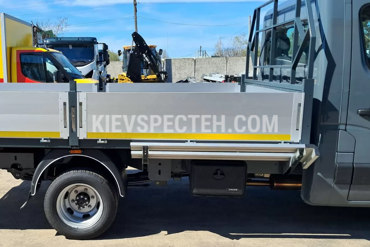 Борти — алюмінієві, набірні з профілю 25 мм: передня стінка, бічні відкидні борти та задній відкидний борт. Для фіксації передбачені імпортні замки — по 2 шт. на кожен борт, що підвищує зручність розвантаження з трьох сторін. Додатково між кабіною та переднім бортом встановлено захист кабіни від зсуву вантажу — спеціальна зварна сталева конструкція. За потреби платформа може постачатися з тентом або без, а також допускає монтаж КМУ за кабіною або за кузовом (за окремою специфікацією).