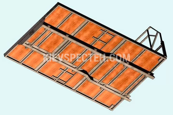Платформа змонтована на сталевій гратчастій рамі з гнутого швелера. Підлога виконана з ламінованої вологостійкої фанери з протиковзною сіткою, закріпленої потайними оцинкованими кріпленнями. По периметру передбачені вантажні вуха (півкільця) для надійної фіксації вантажу.