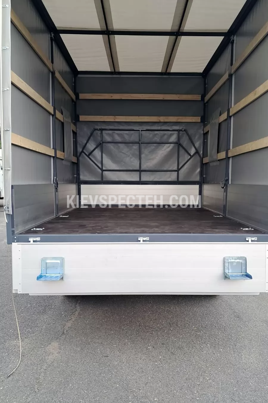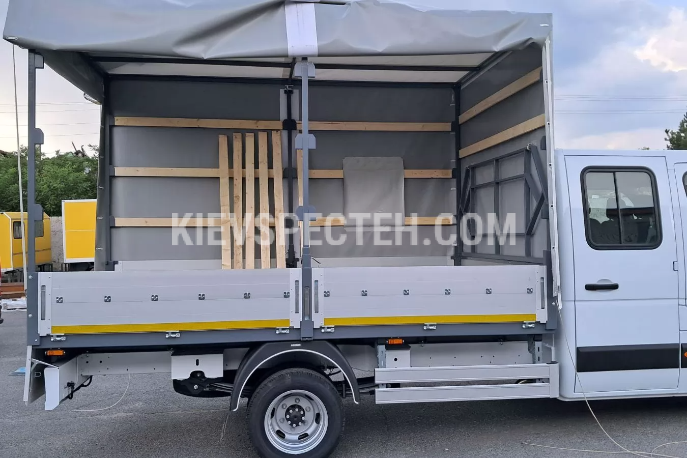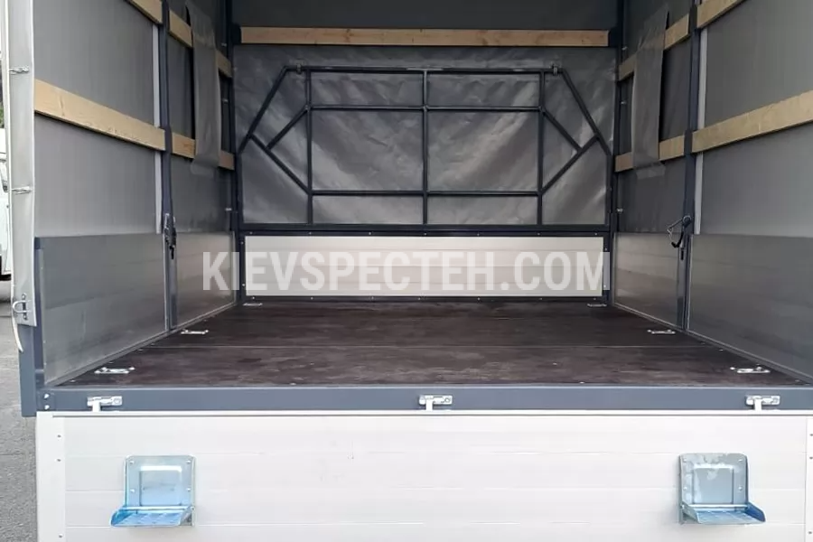 Тент виготовлений з ПВХ-матеріалу, обладнаний шнурівкою ПВХ-тросом Ø6 мм з можливістю пломбування, що важливо для комерційних перевезень. Кабіна — двурядна, 6-місна, що дозволяє перевозити робочу бригаду разом із вантажем. Габаритні розміри шасі (ДхШхВ) 6315х2080х2500 мм. колісна база 3682 мм.