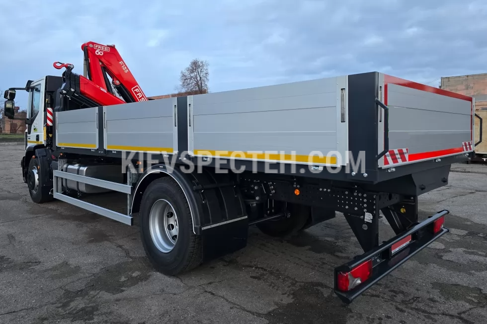 Бортова вантажівка IVECO Eurocargo ML180E28-Е5 з краново-маніпуляторною установкою FASSI F135A.0.23 — професійний вантажний комплекс середньої тоннажності, побудований на міцному шасі класу 18 тонн (GVW 18 000 кг) із колісною формулою 4×2. Максимальна довжина стріли 16,7 м. його вантажопідйомність становить 13 т. Габаритні розміри IVECO Eurocargo ML180E28-Е5 (ДхШхВ) 6269х2495х2835 мм. оснащений двигуном Tector 6 потужністю 206 кВт (280 к.с.). Габаритні розміри КМУ (ДхШхВ) 2380×830×2200 мм.