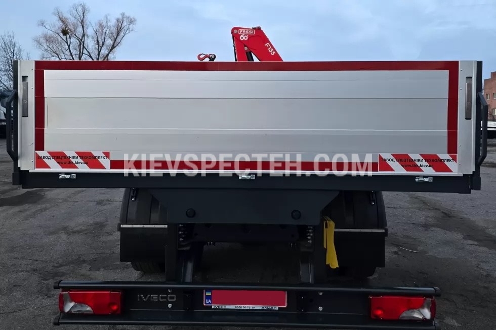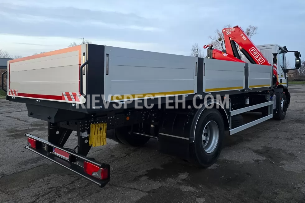 Встановлення КМУ FASSI F135A.0.23 на шасі IVECO Eurocargo ML180E28 робить цю машину універсальною для вантажно-розвантажувальних робіт, монтажу конструкцій, перевезення техніки та будівельних матеріалів. Бортова платформа може мати довжину до 6,0–6,5 м (точний розмір залежить від вибраної бази шасі) з внутрішньою шириною 2450–2500 мм. Конструкція рами IVECO дозволяє працювати з навантаженнями без втрати геометрії, що є критичним для монтажу КМУ середнього класу. Кабіна Eurocargo забезпечує водію зручність і огляд, пропонуючи ергономічне робоче місце та низькі експлуатаційні витрати.