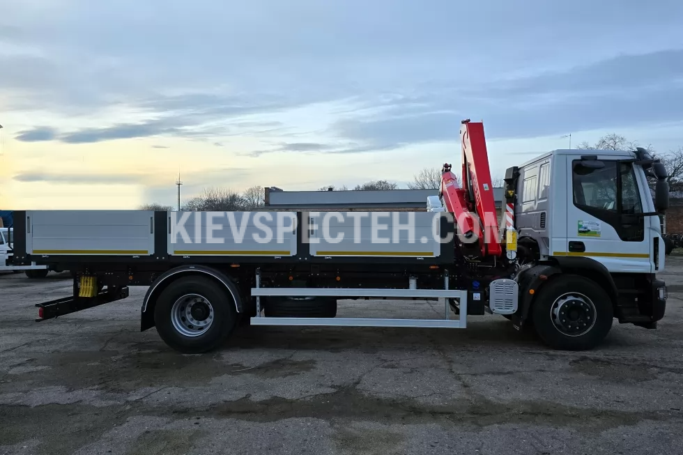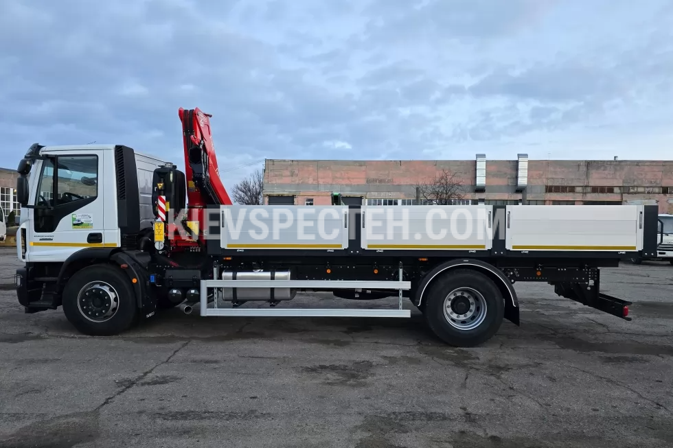Бортова вантажівка IVECO Eurocargo ML180E28-Е5 з краново-маніпуляторною установкою FASSI F135A.0.23 — професійний вантажний комплекс середньої тоннажності, побудований на міцному шасі класу 18 тонн (GVW 18 000 кг) із колісною формулою 4×2. Шасі оснащене 6-циліндровим дизельним двигуном IVECO Tector 6 об’ємом 5,9 л з потужністю 206 кВт (280 к.с.) та максимальним крутним моментом 950 Н·м. Двигун відповідає екологічному стандарту Euro-5 і працює в парі з механічною коробкою передач ZF (6- або 9-ступенева залежно від виконання), що забезпечує високу тяговість і надійну роботу при встановленні КМУ. Стандартне шасі має колісну базу 3690 мм із можливими модифікаціями до довжин понад 5000–6000 мм для монтажу надбудов. Габаритні розміри шасі в базовому виконанні становлять орієнтовно 7,6–9,0 м по довжині, 2,55 м по ширині та 2,8–3,0 м у висоту, залежно від комплектації кабіни та встановленого обладнання. Підвіска ресорна або комбінована, допущені шини 295/80R22.5, передня вісь розрахована на навантаження до 7,1 т, задня — до 11,5 т.