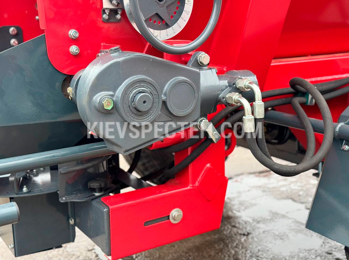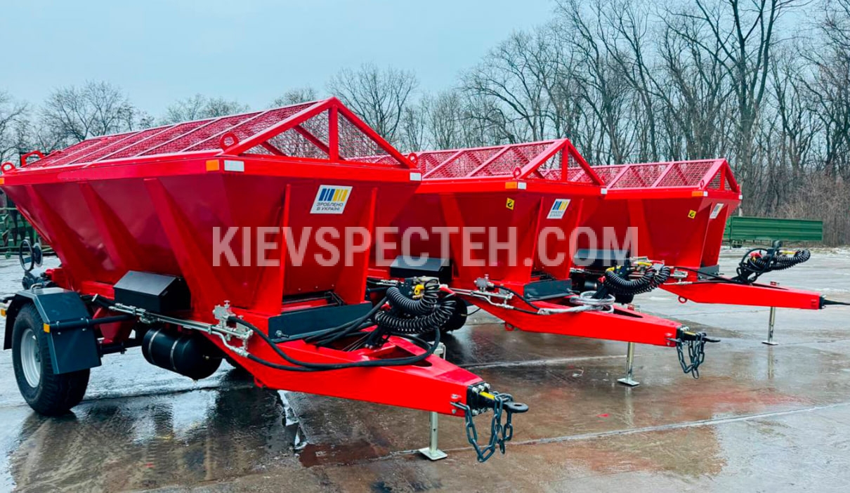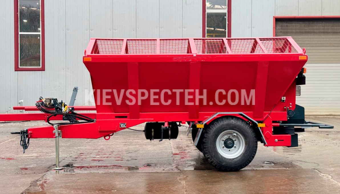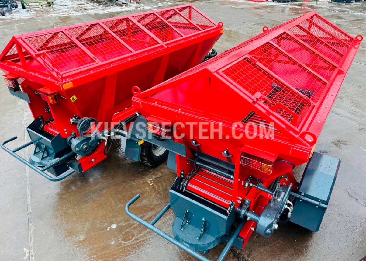 Піскорозкидач оснащений міцним сталевим корпусом і приводиться в дію гідравлічною системою трактора. Матеріал завантажується зверху через захисну решітку, яка запобігає потраплянню великих предметів. Висота завантаження становить 1,8–2,2 м, що зручно для роботи з навантажувальним обладнанням.