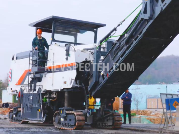 Конвейерная система оборудована транспортерной лентой шириной 800 мм с возможностью поворота на ±45°, что обеспечивает гибкую и точную отгрузку фрезерованного материала в самосвалы с обеих сторон машины. Рабочая скорость фрезерования составляет 0–83 м/мин, транспортная скорость — 0–5 км/ч.