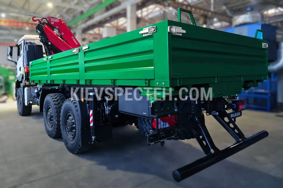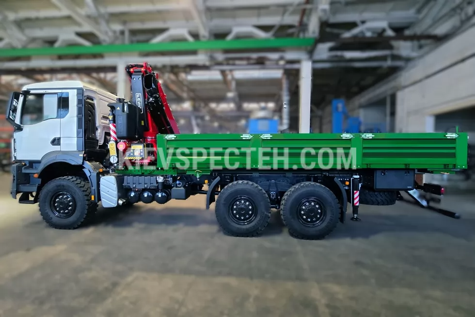 Усиленная рама и рессорная подвеска с гидравлическими амортизаторами приспособлены к монтажу КМУ и эксплуатации на пересеченной местности.