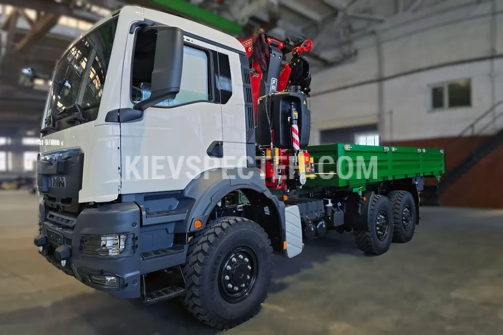 Полный привод 6×6 гарантирует уверенную проходимость на бездорожье, а система блокировки межосевых и межколесных дифференциалов обеспечивает надежное сцепление колес даже на слабых или скользких поверхностях. Трансмиссия типа MAN TipMatic 12.28 OD сочетает эффективность механической коробки с комфортом автоматического управления. Максимальная полная масса автомобиля составляет 33 000 кг, колесная база — около 4 500 мм, а общие габариты шасси — длина примерно 7 500 мм, ширина 2 500 мм, высота от 3 300 до 38 мм. Такая геометрия обеспечивает оптимальный баланс между устойчивостью, маневренностью и грузоподъемностью.