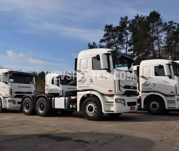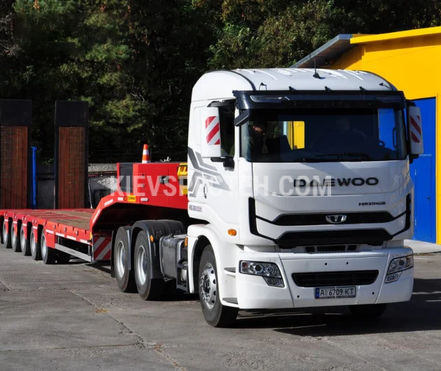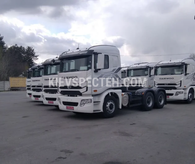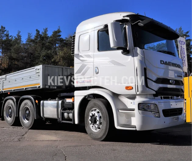 Седельный тягач на базе Daewoo Maximus TRT 6x4 предназначен для работы с большегрузными полуприцепами и эксплуатации в условиях повышенных нагрузок, включая строительные перевозки, нефтегазовый сектор и магистральную логистику. Колесная формула 6х4, грузоподъемность 55000 кг. Габаритные размеры шасси (ДхШхВ) 6960×2495×3330 мм., количество осей 3.