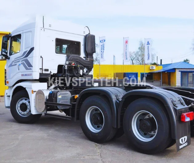 Силовая установка представлена дизельным двигателем Doosan серии DX12 рабочим объемом 11 л стандарта Евро-5, развивающим мощность 440 л.с. при 1900 об/мин, формируя высокий крутящий момент для стабильной работы под погрузкой. В сочетании с механической коробкой ZF обеспечивается эффективная передача мощности и надежная работа в широком диапазоне скоростей. Максимальная скорость тягача составляет 100 км/ч, что позволяет использовать как для магистральных перевозок, так и для работы в пределах строительных объектов.