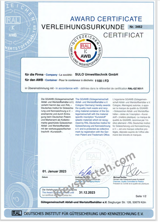 Контейнер полностью отвечает требованиям европейского стандарта DIN EN 840-3 и имеет международные сертификаты качества — ISO 14001:2015, TÜV Rheinland, RAL службой Украины. Продукция бренда SULO, производимого в Германии, адаптирована к интенсивному использованию в украинских климатических условиях при температурах от –40 °C до +50 °C.