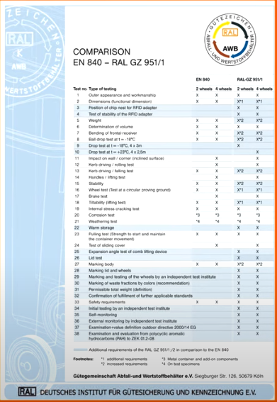 Контейнер полностью отвечает требованиям европейского стандарта DIN EN 840-3 и имеет международные сертификаты качества — ISO 14001:2015, TÜV Rheinland, RAL службой Украины. Продукция бренда SULO, производимого в Германии, адаптирована к интенсивному использованию в украинских климатических условиях при температурах от –40 °C до +50 °C.
