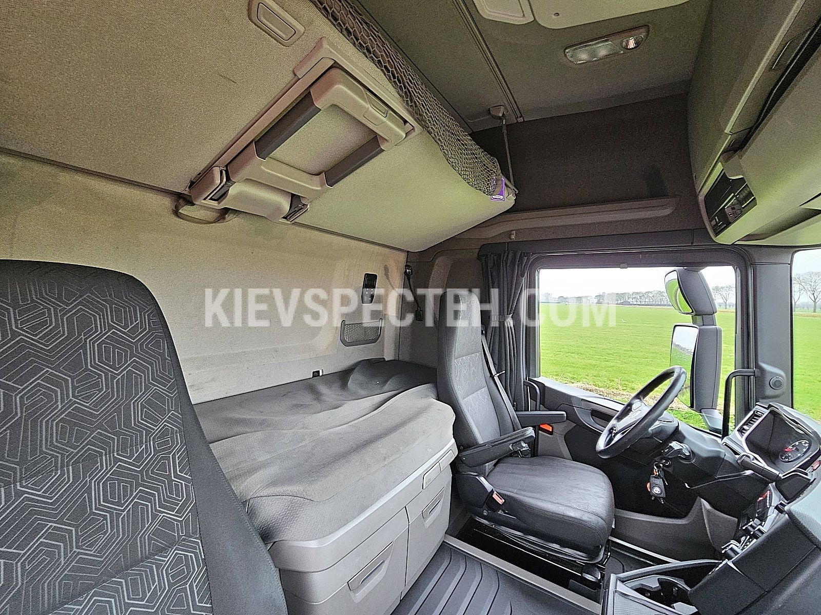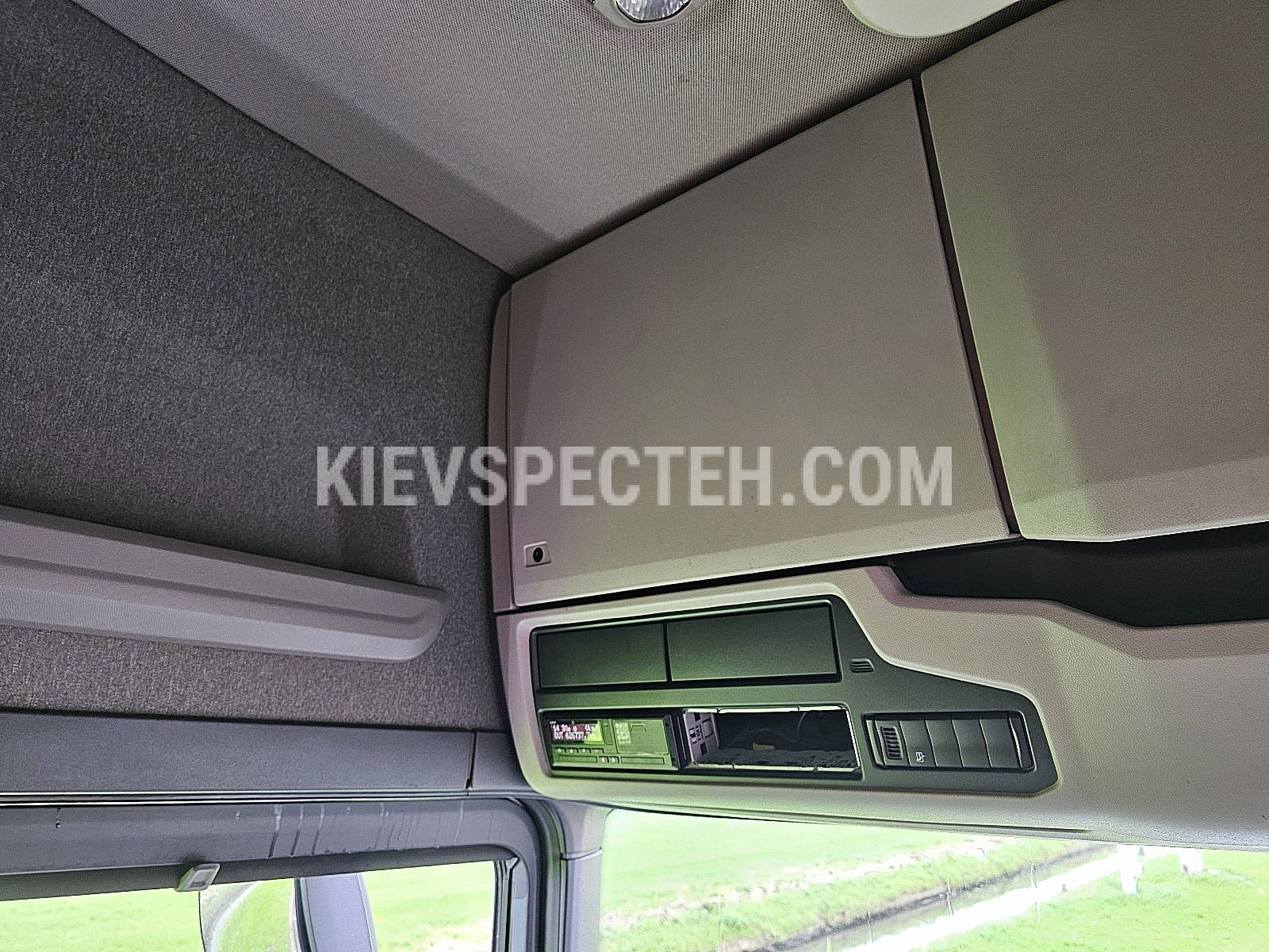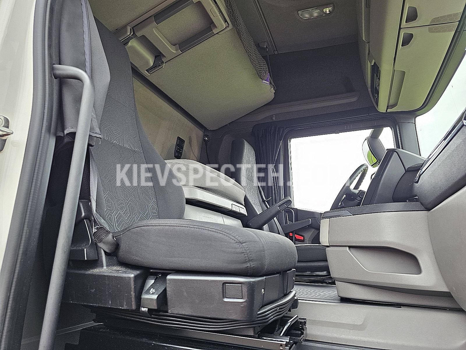Кабіна — спальна, з компонуванням сидінь 1+1, оббивка сидінь — тканина, регулювання — ручне. Оснащення включає клімат-контроль, кондиціонер, автономний опалювач, круїз-контроль, цифровий тахограф, електросклопідйомники, електрорегулювання та підігрів дзеркал, центральний замок, мультимедійну систему з Bluetooth і CarPlay, галогенне освітлення та систему допомоги утримання в смузі руху. Колір кабіни — білий.